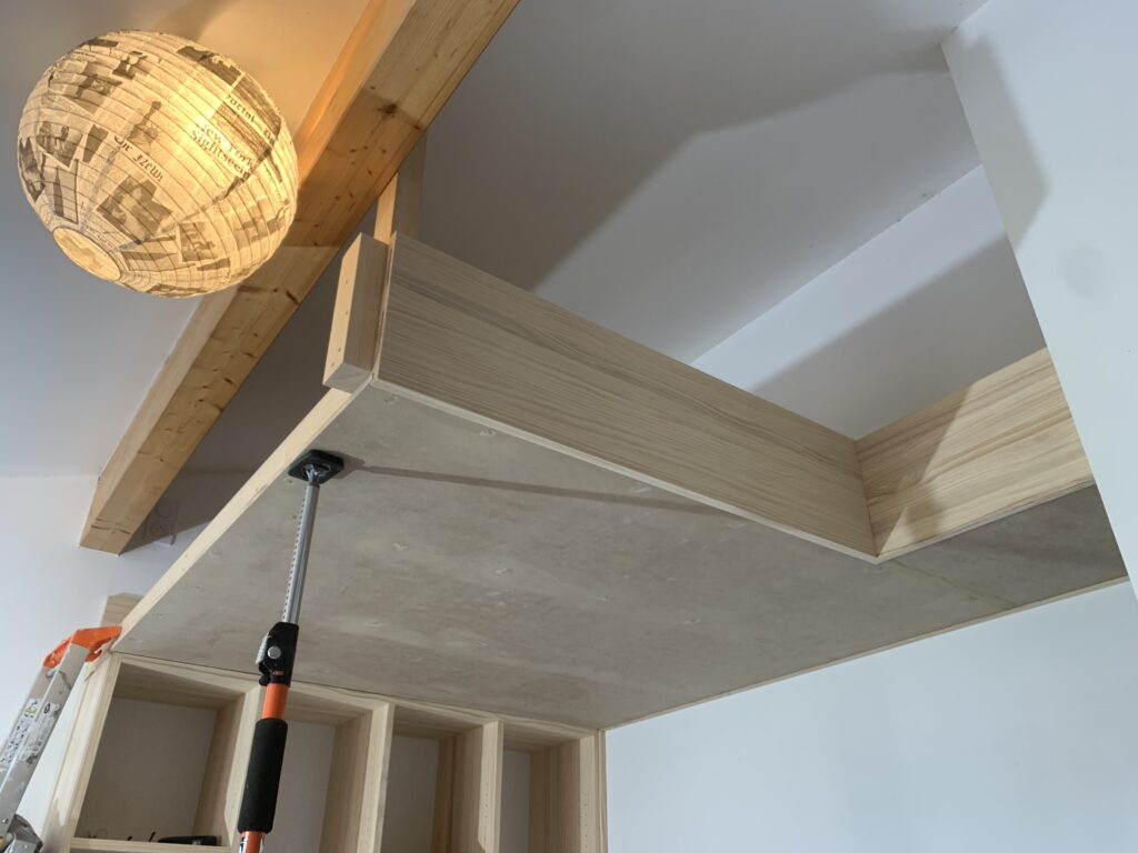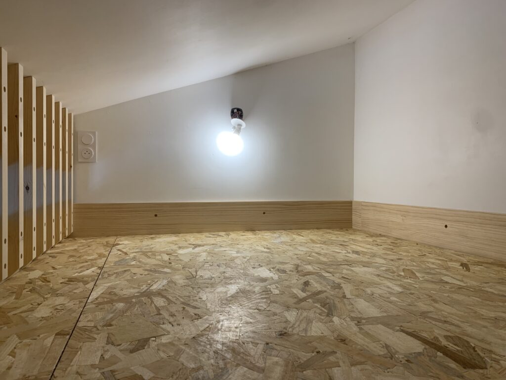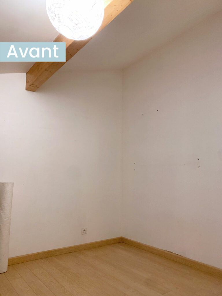 Optimisation de l’espace d’une chambre d’enfant par le remplacement d’un lit simple superposé par un aménagement incluant un lit double suspendu et d’une petite bibliothèque en bois massif.
